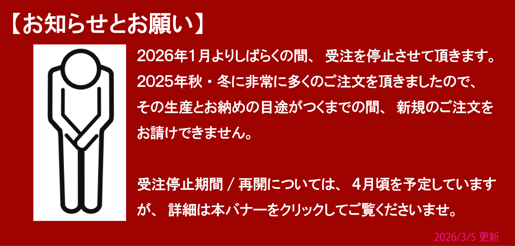 - 2025/5/2 ご迷惑をおかけしていました3月~4月末までの受注停止は終了しました。ただ、現在からのご注文も通常よりやや長めの納期をお願いする形となります。ご不便をおかけしますが、何卒宜しくお願い申し上げます。