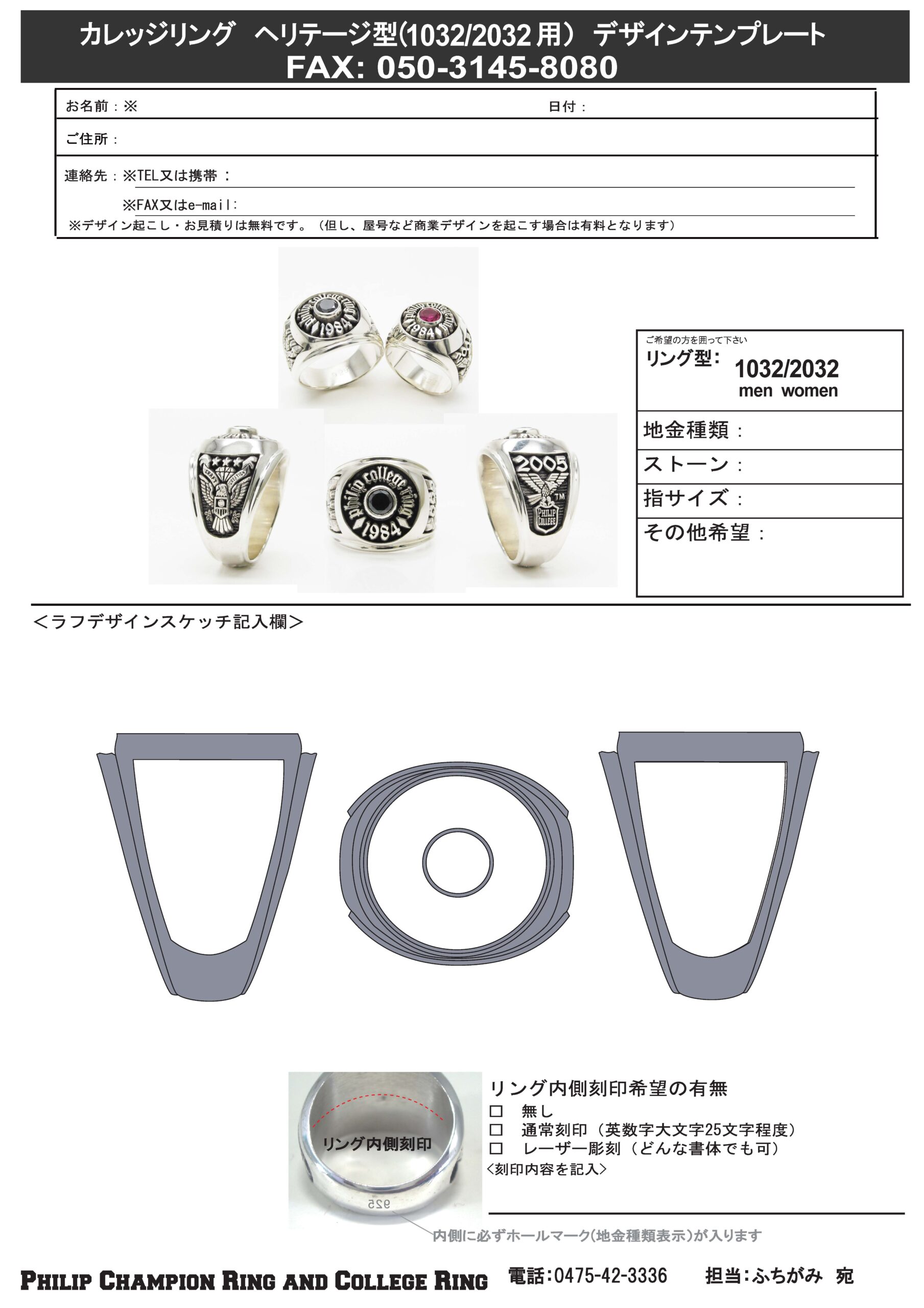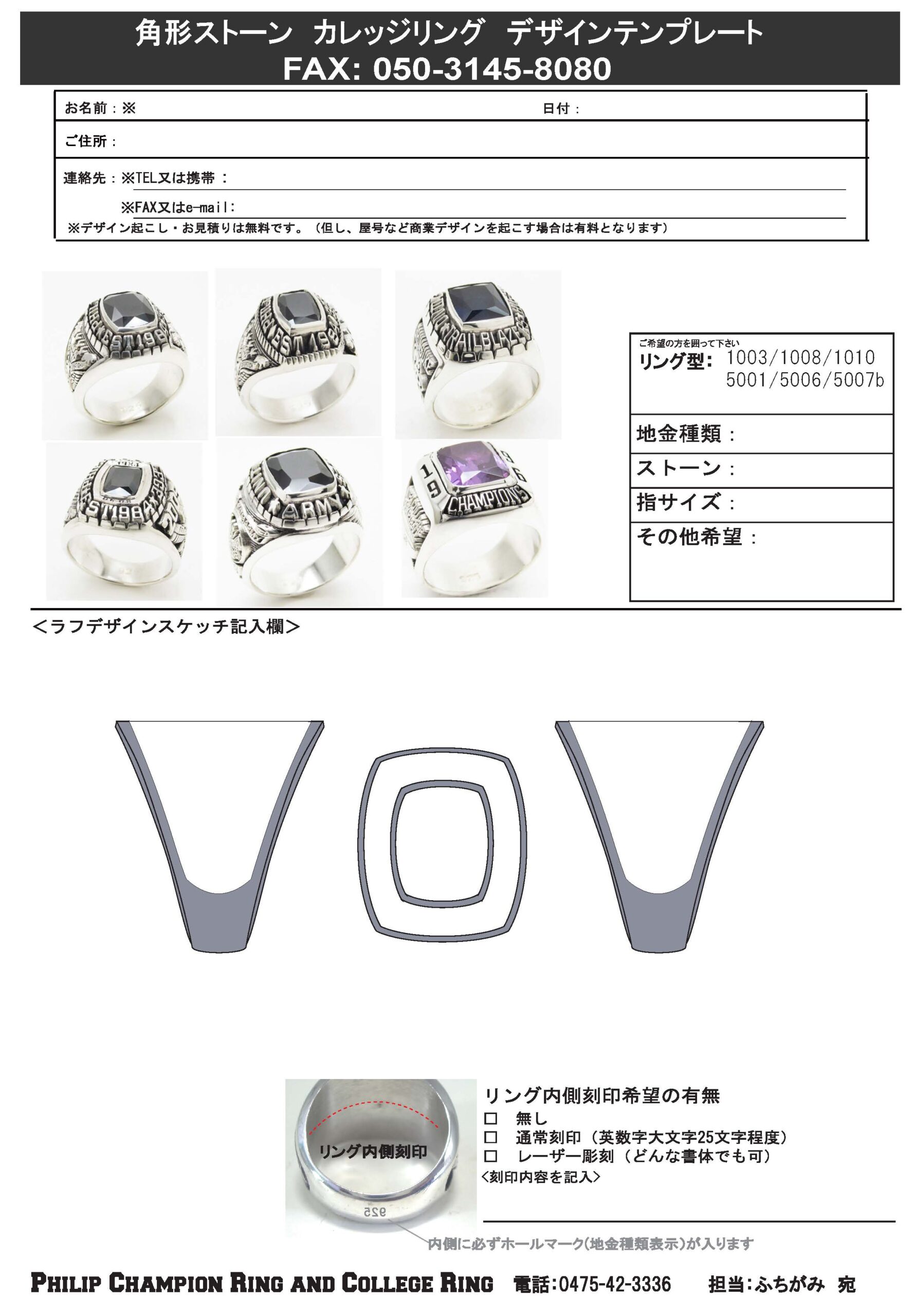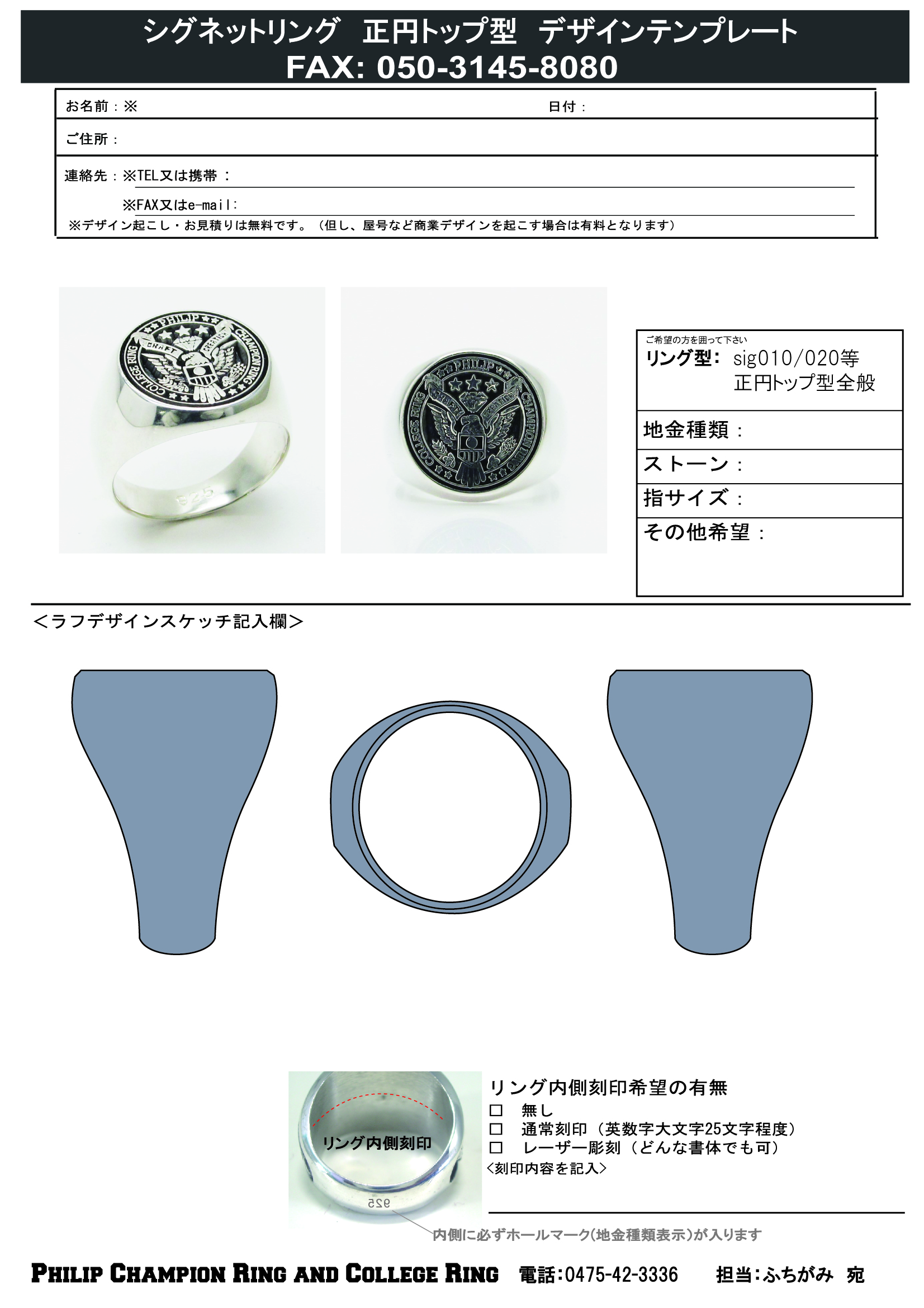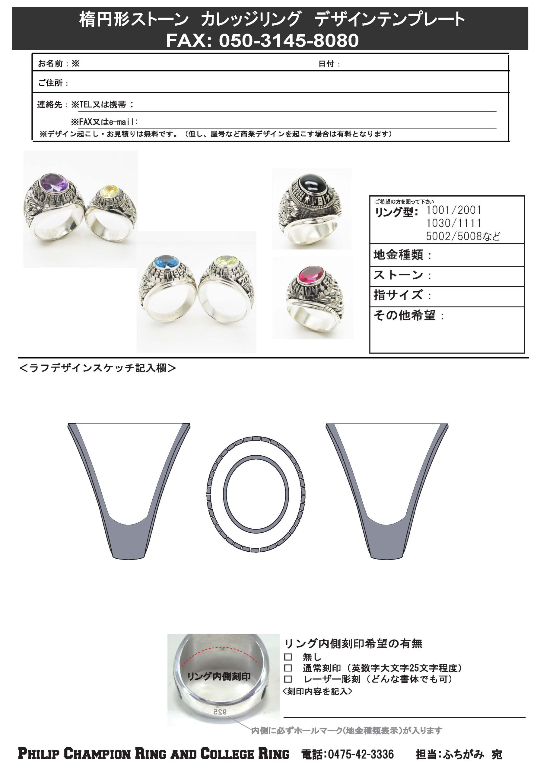 オリジナルデザイン・カスタムメイドデザインのカレッジリングをご注文頂く際のデザイン・仕様ご指示書です。