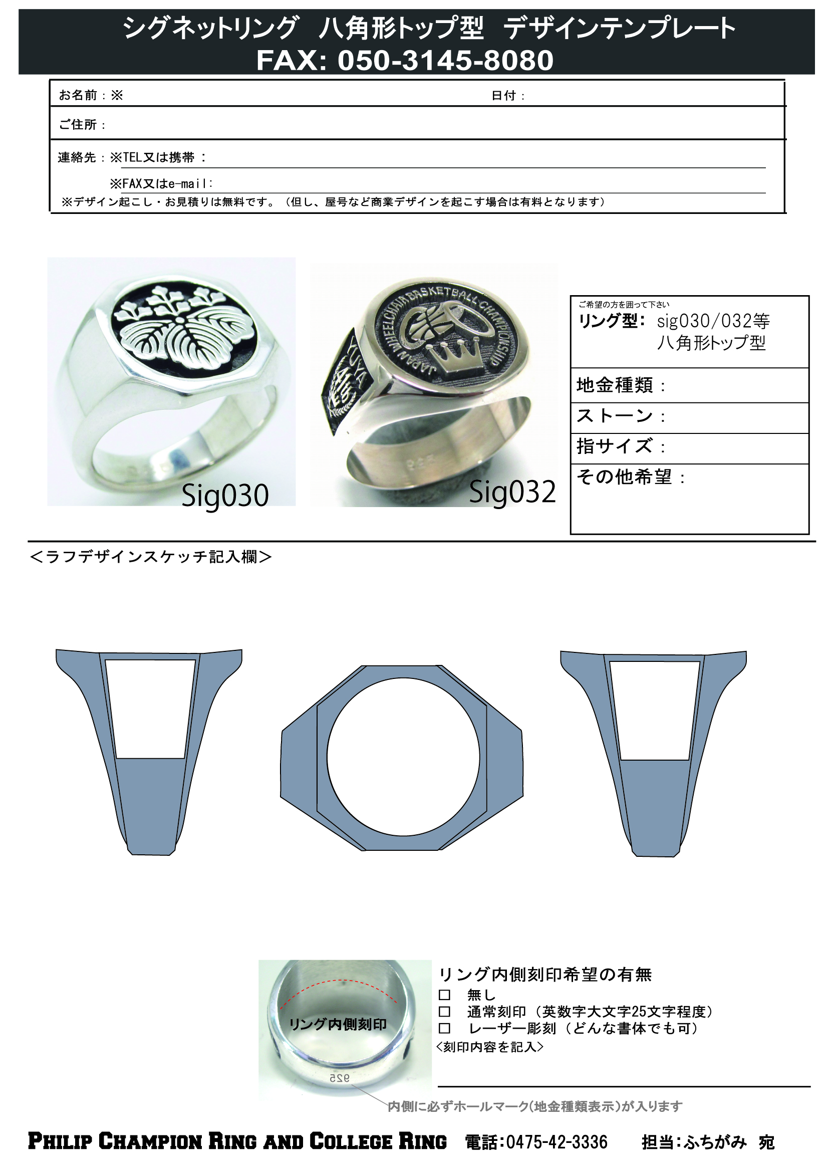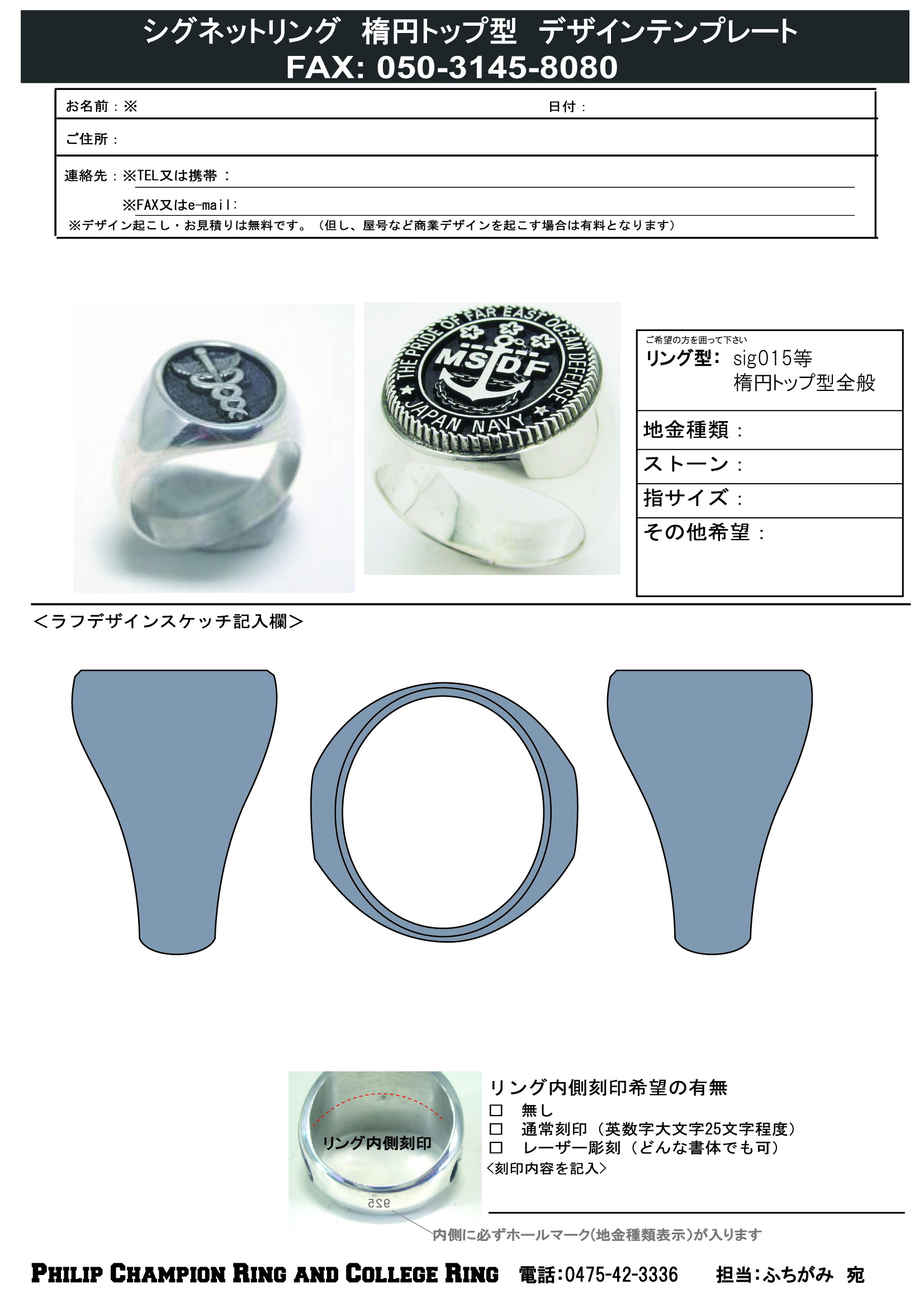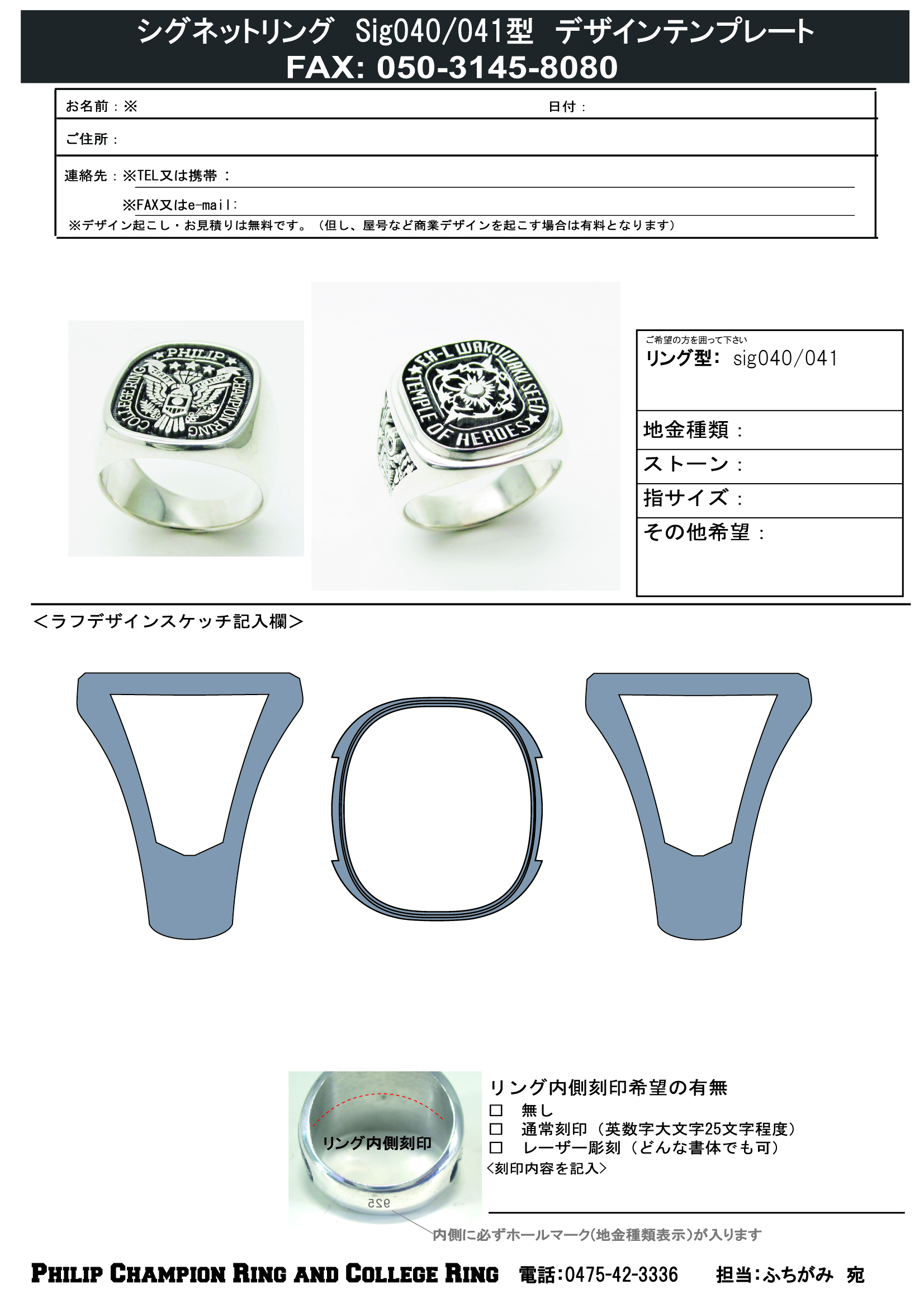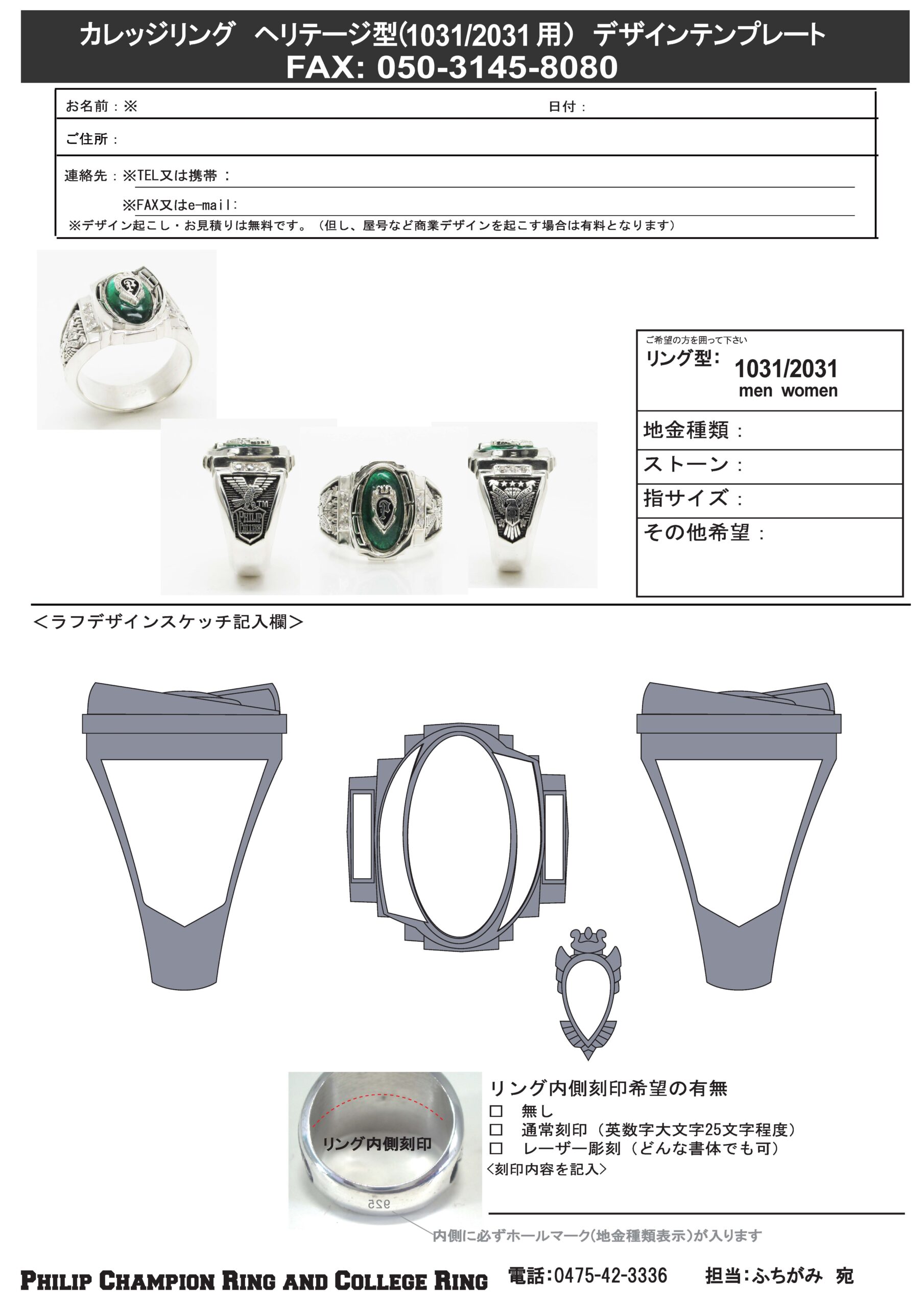 オリジナルデザイン・カスタムメイドデザインのカレッジリングをご注文頂く際のデザイン・仕様ご指示書です。