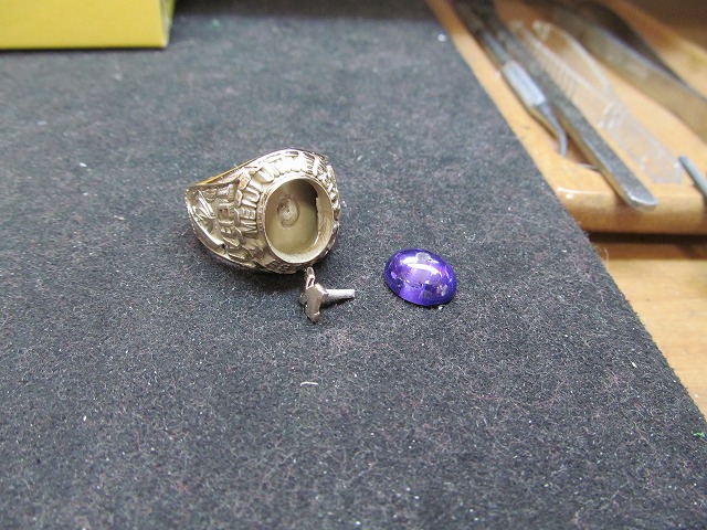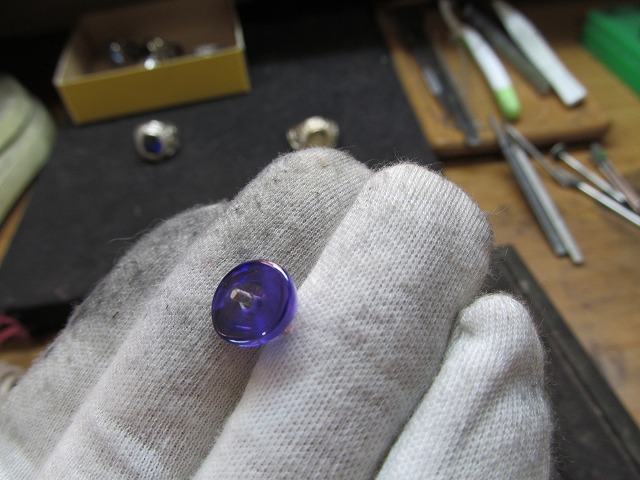 センターストーンのアメシスト(ラウンドカット)に穴開け