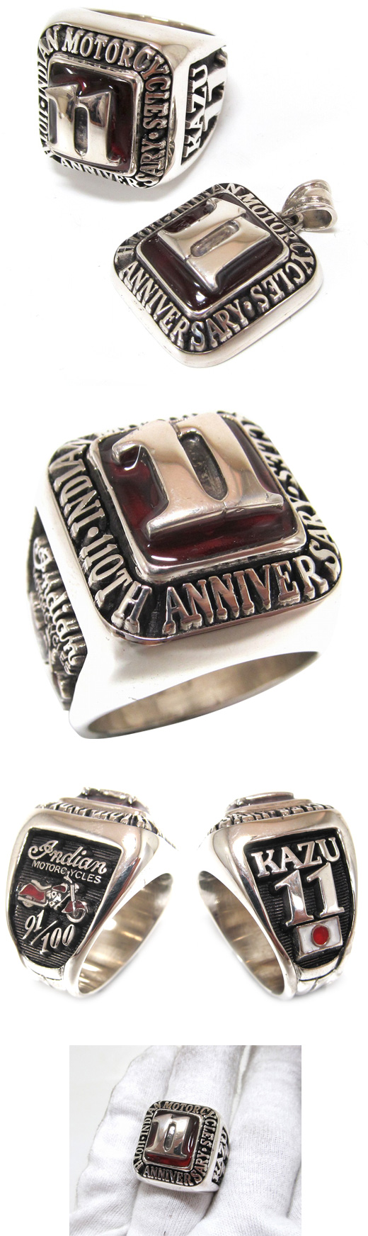 ずっと欲しかったIndian Motorcycle(アメリカで最も古いブランドのオートバイ)を購入された記念にとお作り頂いたリングと、その石座金型を応用したペンダントトップ。バイクのタンクやチェーンカバーなどの部分を凹で作り、KAZU様の愛車と同色のエナメルで着色しました。