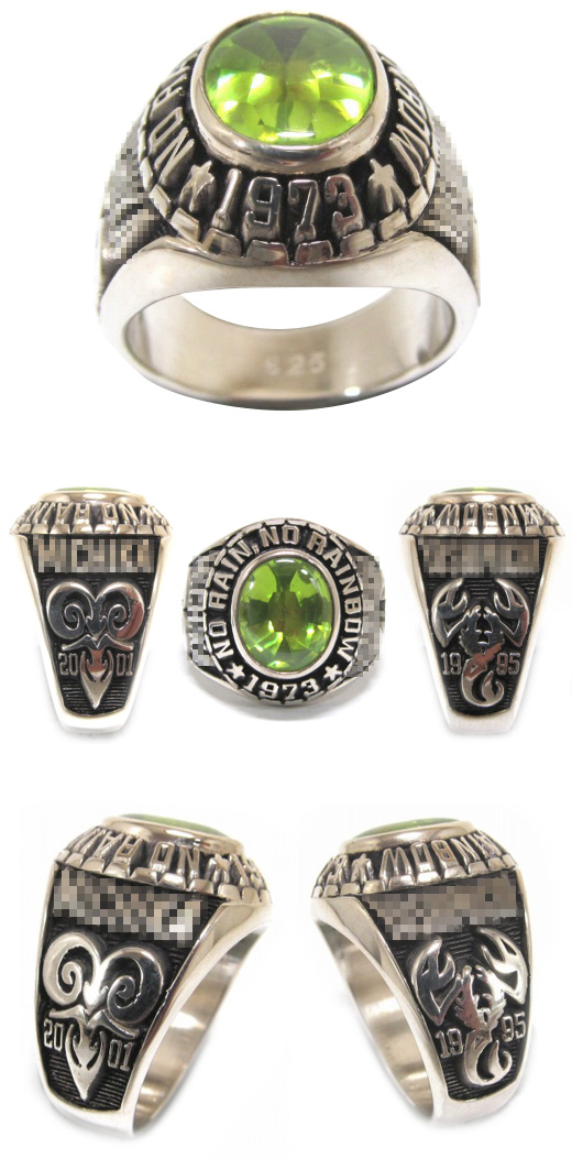 さそり座とおひつじ座です。12星座はカレッジリングのデザインに良く使いますが、このS様オリジナルデザインのさそり座とおひつじ座は、とってもいい感じです。ストーンはペリドットのラウンド・バックファセットカット。