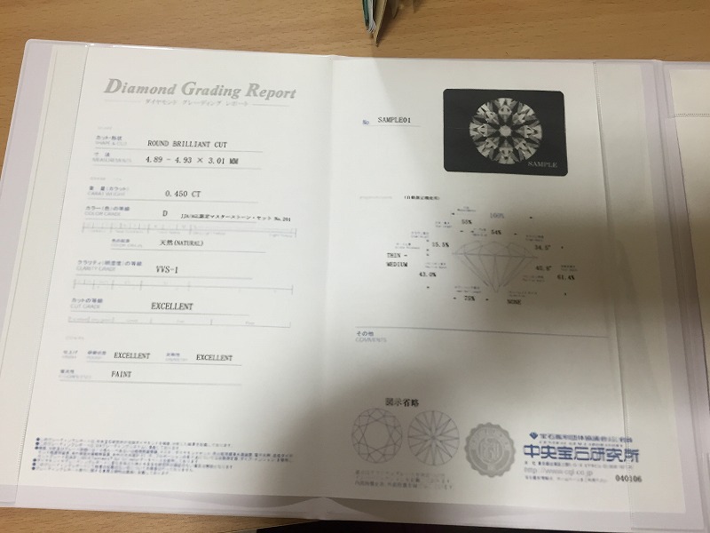 このダイヤは、カラットは直径4mm=0.45ct前後で統一。そして透明度・色・カットともに最高級の「エクセレント」の格付けでした。