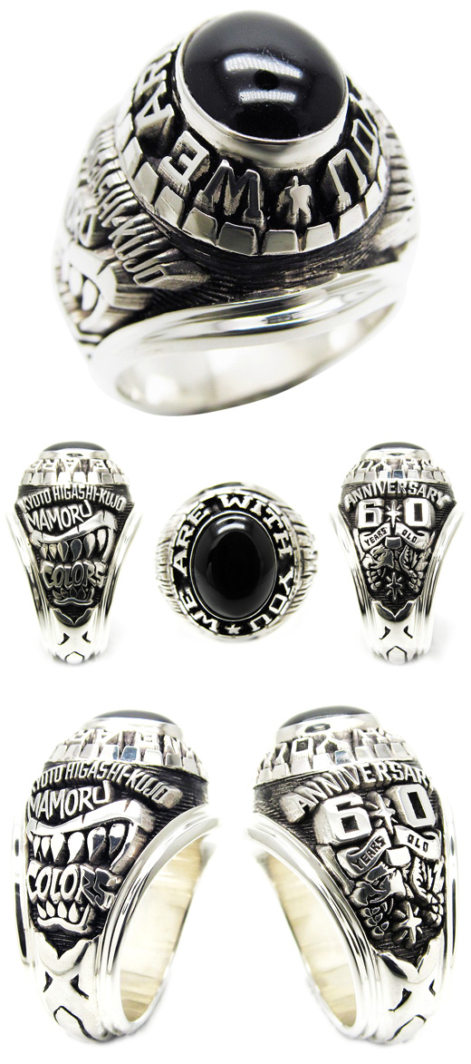 お若い頃からの仲間(チーム名:COLORS)のリーダーMAMORU様へのメンバーからの還暦祝いギフトとしてお作り頂いた品です。牙の口のCOLORSのロゴは、アメリカ・LAの有名デザイナーに依頼して制作されたものとの事。このロゴがメチャかっこいいので、弊社よりお願いしてカレッジリング博物館に掲載させて頂きました。