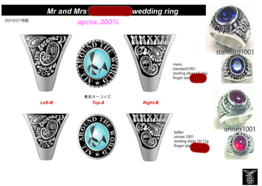 ご主人・奥様で話し合われたイメージは、お二方とも1960-70年代のサイケデリックロックがお好きとの事でペイズリー柄をメインに、地球をイメージするような青いターコイズをとの事で、手書きのイメージ図などもお送り頂きました。