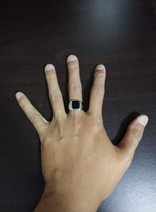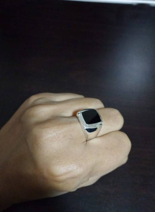 発売直後にご注文頂いたY様は、デフォルトのオニキス(プレートカット)をお選び頂きました。銀と黒のシックな見た目のこのリングは、服装やTPOを選ばず着用出来ます。