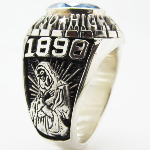 左サイドにはマリア会を象徴するようにマリア様と学校創設年、右サイドにはご卒業年と学校章をお入れしました。