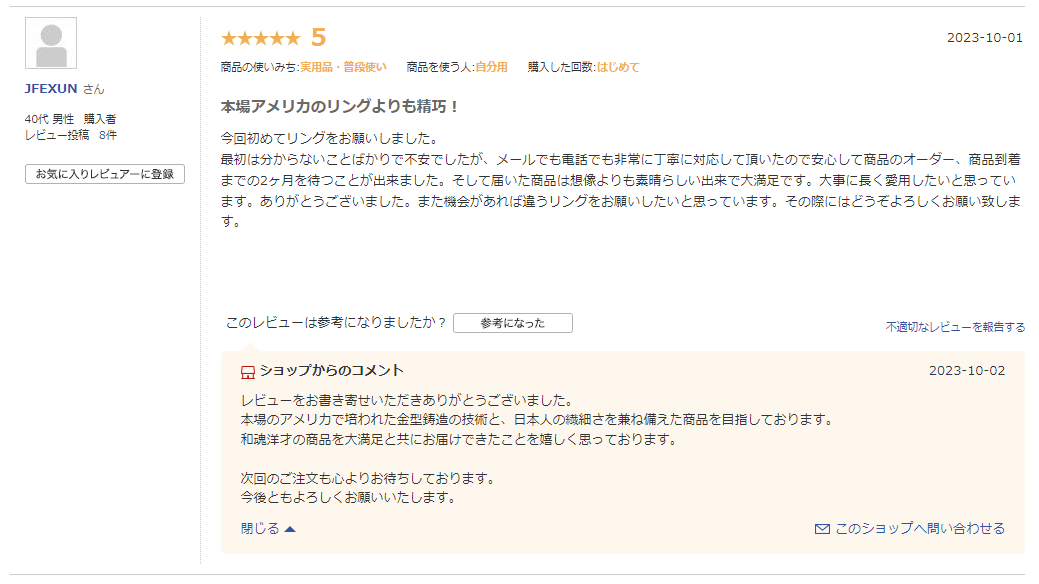 「本場アメリカのリングよりも精巧!」とは嬉しい限りです。